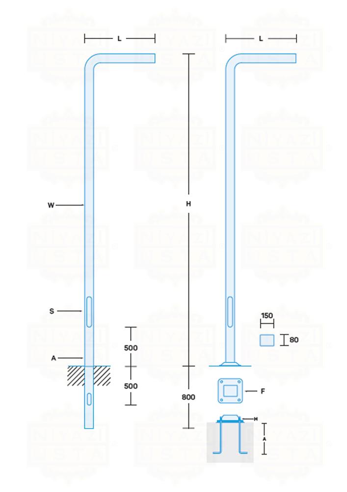 | Ürün Kodu | Direk Yüksekliği | Profil Ölçüsü | Kalınlık | Sigorta Kapağı | Flanş Ölçüleri ve Kalınlık |